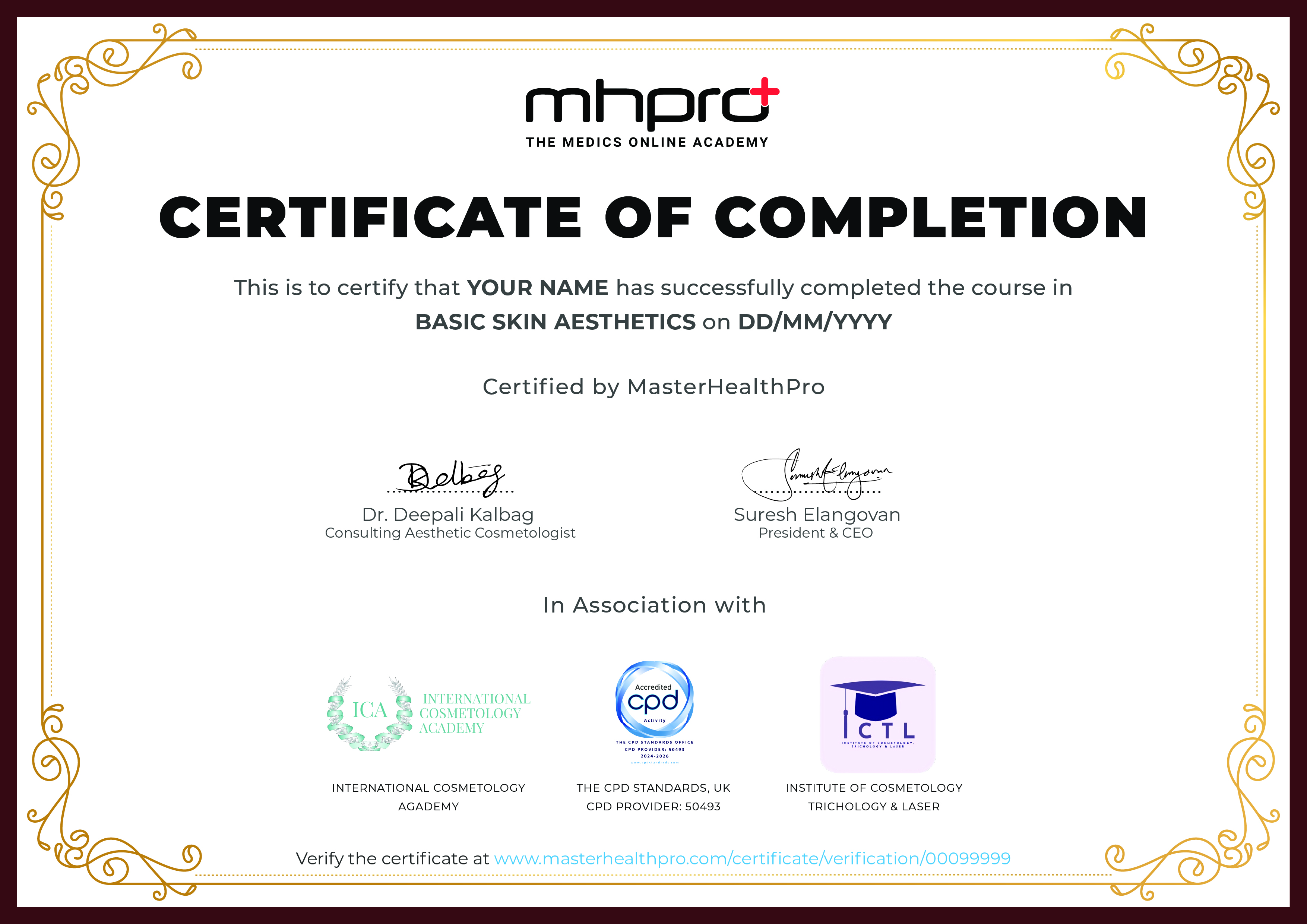 This course delves deep into the technical practice of clinical cosmetology that involves altering the physiology of the skin for better aesthetic appearance, according to the patients concerns. It is the study and application of beauty treatments for concerns such as pigmentations, fine lines, wrinkles, sagged face, acne, rosacea, melasma, uneven skin tone among many others. For those pursuing a career in medical cosmetology, this course can be used as an introduction to understand the science of skin in its simplest terms, by trained medical professionals.