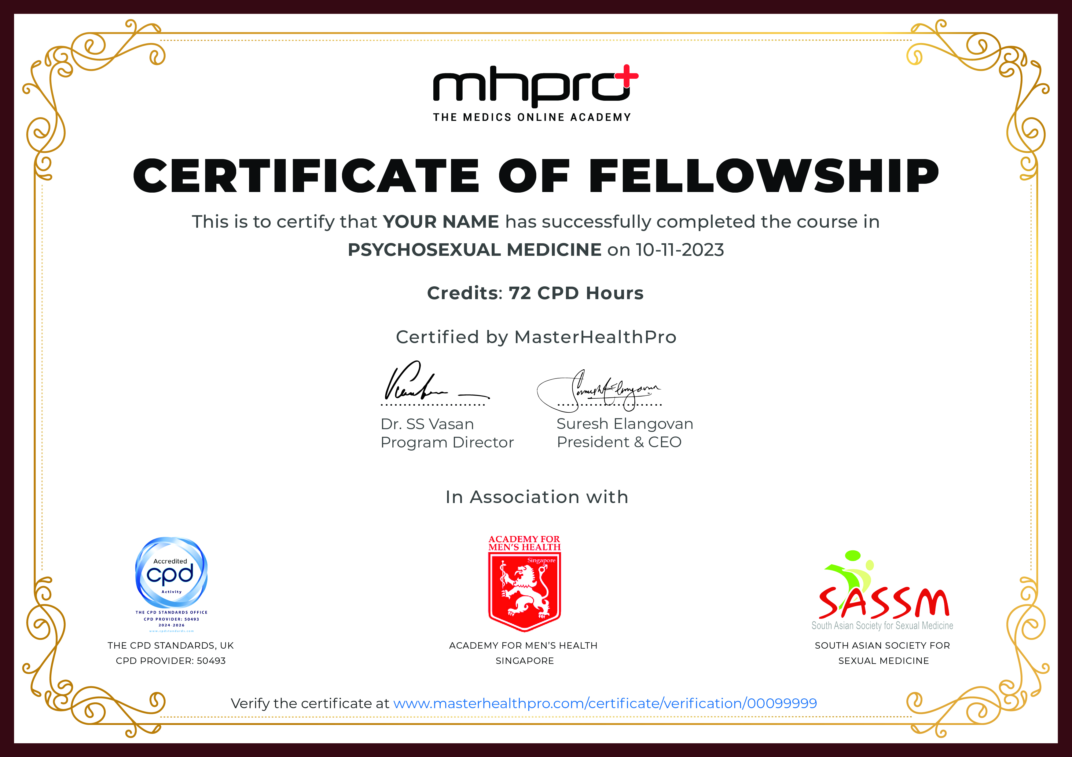 This comprehensive course provides Medical Professionals an opportunity to learn and practice various skills involving the psychological aspects of sexual medicine. Delivered by renowned sexual medicine experts and curated aesthetically to provide scientifically evidence-based approaches for evaluation, diagnosis, and management in clinical practice